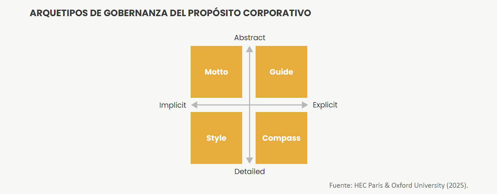 El estudio identifica cuatro arquetipos de gobernanza, que muestran cómo las empresas gestionan el propósito en la práctica y cuáles son las ventajas y riesgos de cada modelo:
