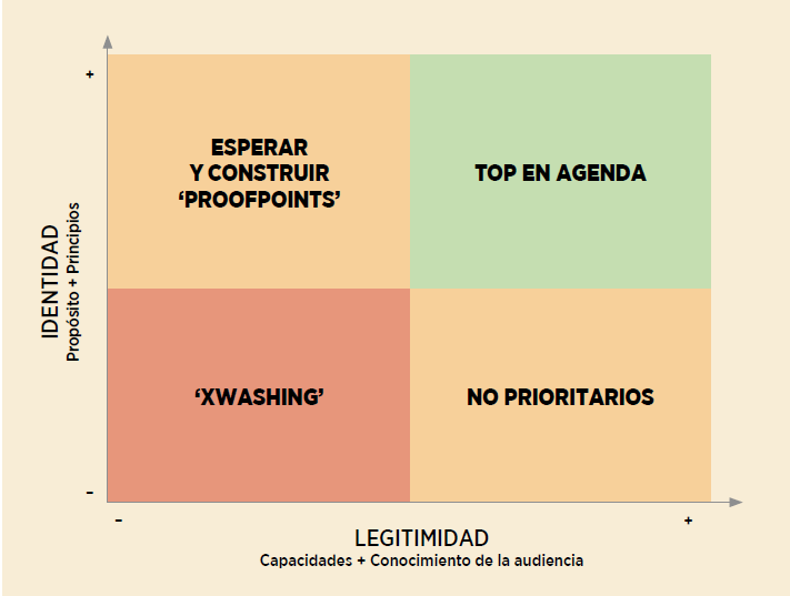 Para ello, el artículo propone un marco basado en dos variables: identidad -grado de alineación del mensaje con el propósito y valores de la empresa- y legitimidad -conocimiento del público y capacidades para ofrecer una experiencia coherente-.